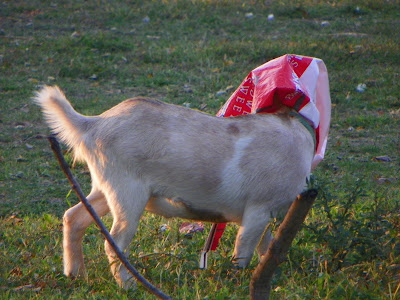 I know, shame on me for laughing at my Lucky goat. I even teased him just a little by calling his name. He called back and was trying to find me. I couldn't take it, I had to pull the bag off for him. He was happy to see me and didn't care that I laughed! He just can't help being a curious goat since he's never seen a feed sack before...Really??